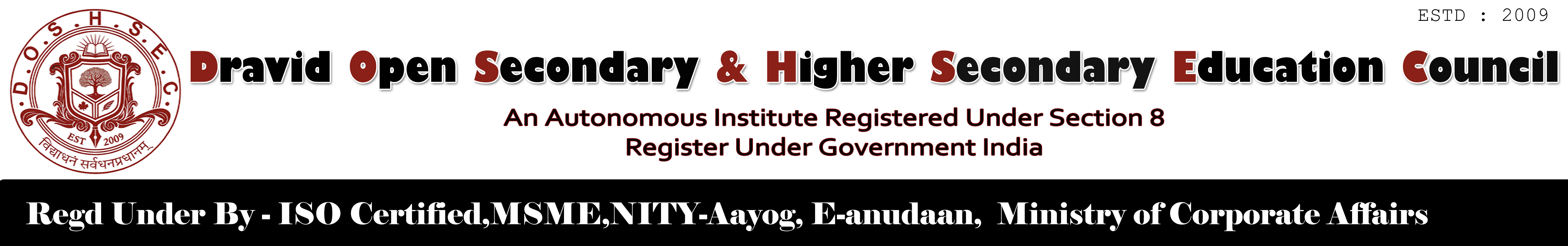 Established in 2009, the Dravid Open Secondary and Higher Secondary Education Council (DOSHSEC) is dedicated to expanding the reach of quality education across the Dravidian region of India, covering Tamil Nadu, Kerala, Karnataka, Andhra Pradesh, and Telangana. Our mission is to empower rural, tribal, and socio-economically marginalized communities by providing flexible, affordable, and recognized learning opportunities in secondary and higher secondary education. We are committed to bridging the educational divide for those excluded from mainstream schooling due to economic, geographic, or systemic barriers. Through an inclusive open learning framework, we deliver curricula that are academically rigorous, culturally relevant, and adapted to the realities of rural life. Rooted in the cultural and linguistic heritage of South India, DOSHSEC emphasizes mother-tongue instruction, context-sensitive pedagogy, and values-based education. Our goal is to nurture potential, instill confidence, and equip learners with the skills and knowledge to contribute meaningfully to society, thereby fostering social upliftment and regional progress. Our Vision To create an equitable educational landscape where every learner—regardless of economic background, geographic location, or social status—has access to secondary and higher secondary education that is affordable, flexible, and nationally recognized.